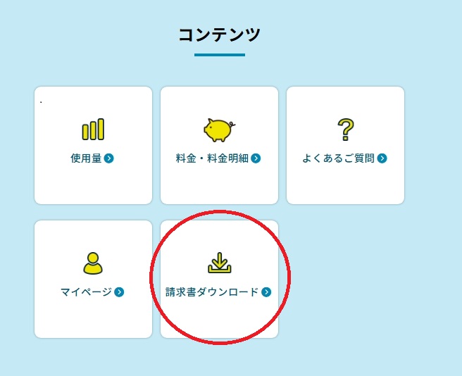 電子請求書は、ポータルサイトトップページ下部にありますコンテンツ欄内の「請求書ダウンロード」よりZIP形式でダウンロードできます。